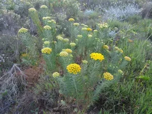 Athanasia crithmifolia is a resilient, aromatic shrub native to South Africa's coastal regions, known for its finely divided leaves and persistent yellow flower heads.