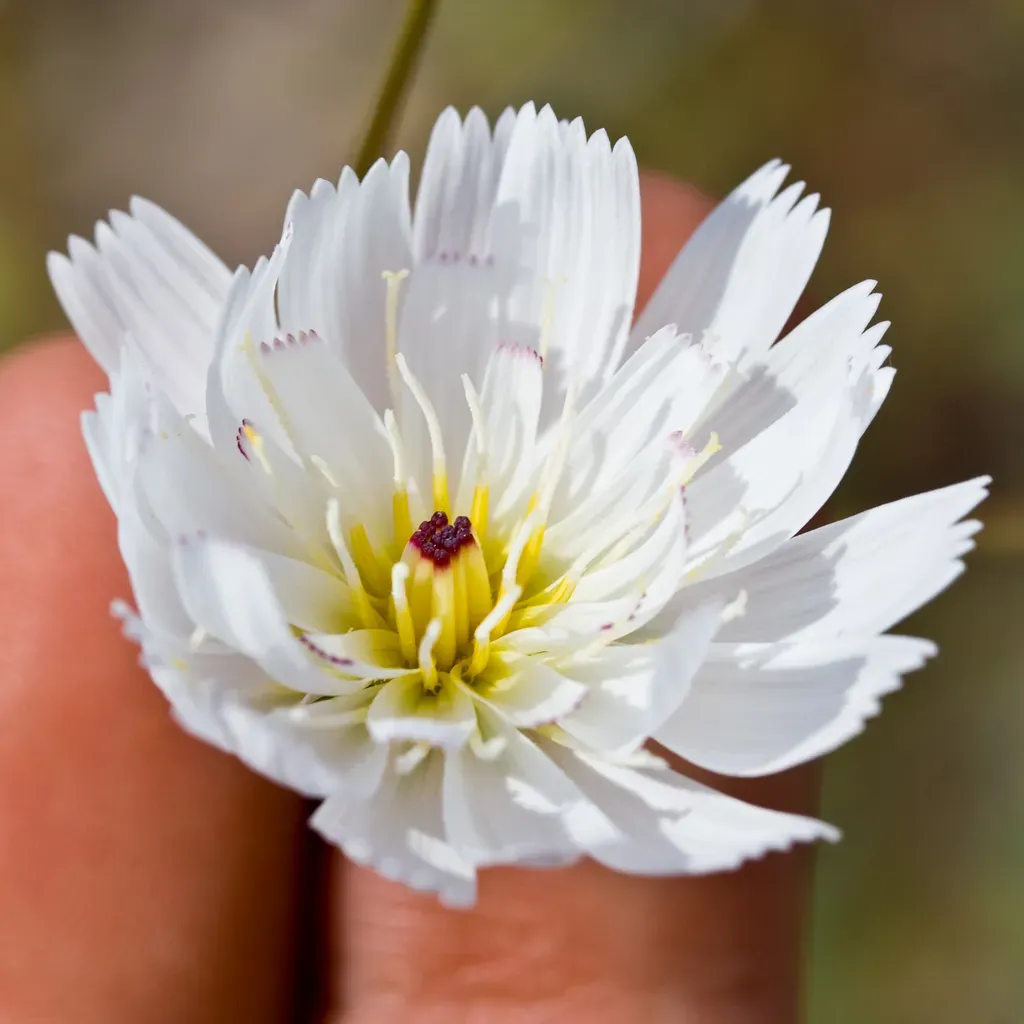 Atrichoseris platyphylla is an annual herb native to the deserts of the southwestern United States and northwestern Mexico, characterized by a basal rosette of gray-green and purple-patterned leaves and fragrant white to pale pink flowers.