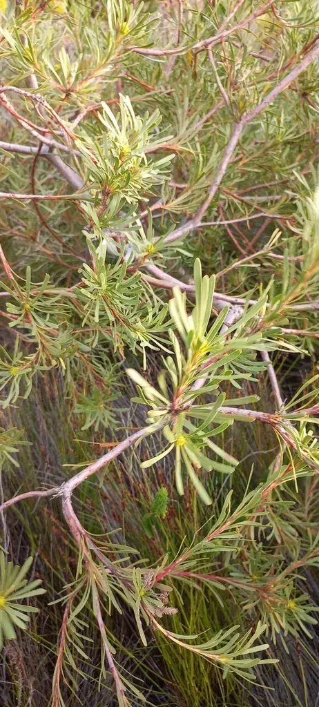 Aulax cancellata is a distinctive fynbos shrub native to South Africa, known for its needle-like leaves and yellow, feathery flowers.