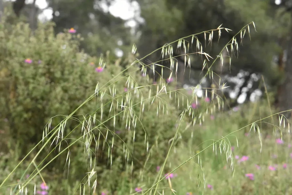 Avena sterilis is an annual grass species known commonly as sterile oat or wild oat, characterized by tall erect stems and fibrous roots.