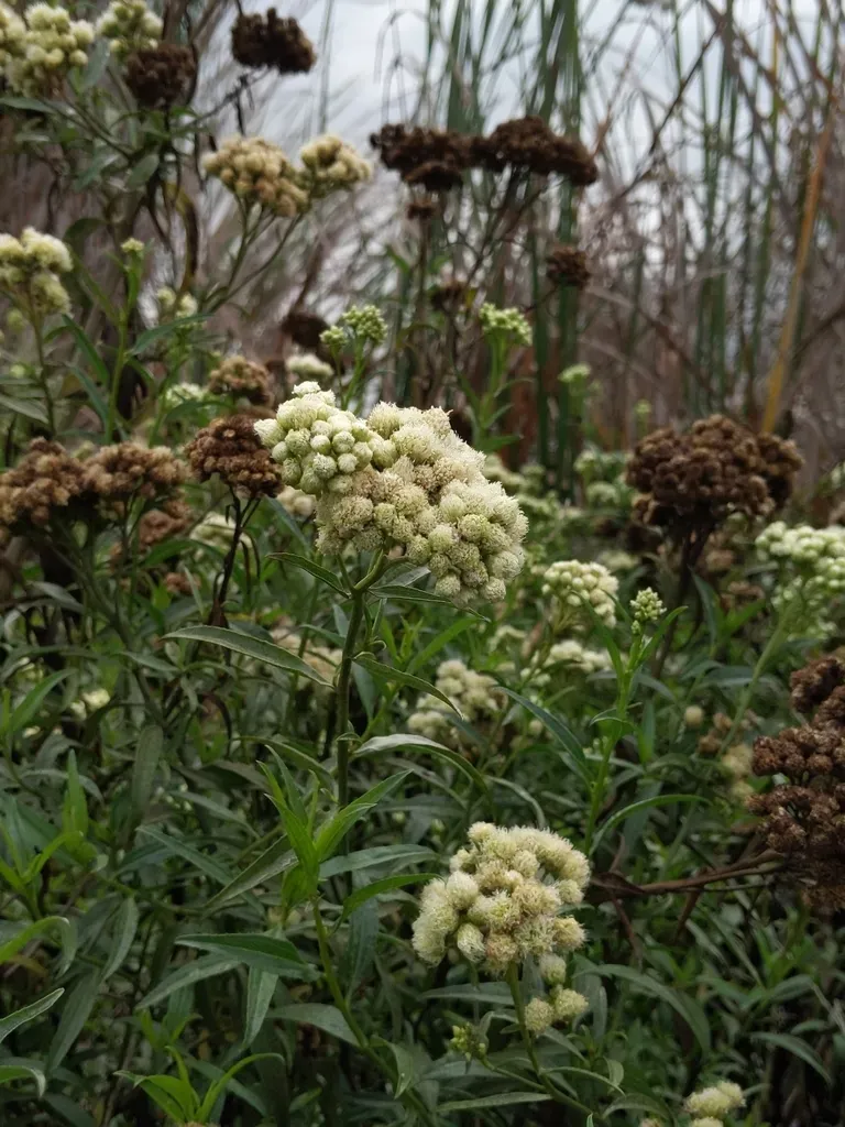 Baccharis glutinosa is a perennial herb or shrub native to marshy and coastal areas, characterized by sticky or shiny glandular leaves and dioecious flowers.