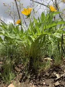 Balsamorhiza macrophylla is a perennial herbaceous plant known for its large sunflower-like blossoms and cutleaf foliage.