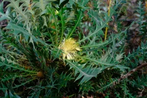 Banksia armata is a prickly, lignotuberous shrub endemic to Western Australia, known for its yellow-cream flowers blooming from June to October.