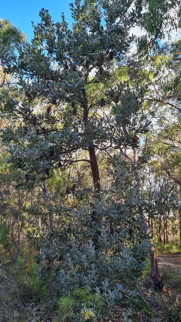 Banksia serrata is a small tree or large shrub native to Australia, known for its distinctive serrated leaves and large cream flower spikes.