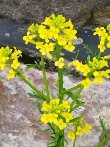 Barbarea verna is a biennial herbaceous plant known for its edible, spicy leaves and bright yellow flowers.