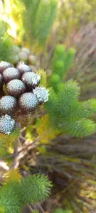 Berzelia albiflora is a tall, slender, single-stemmed but well-branched shrub, reaching 2-3 meters in height with long, slender, densely leafy branches.