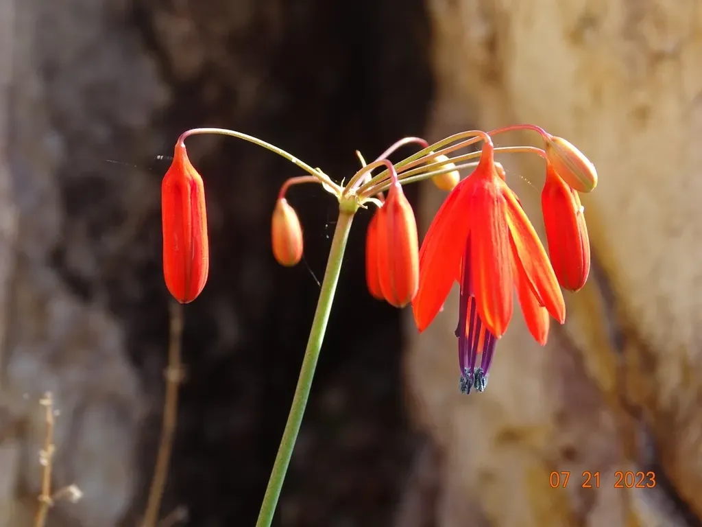 Bessera elegans is a bulbous perennial plant known for its slender stems and striking orange-red flowers with creamy white centers.