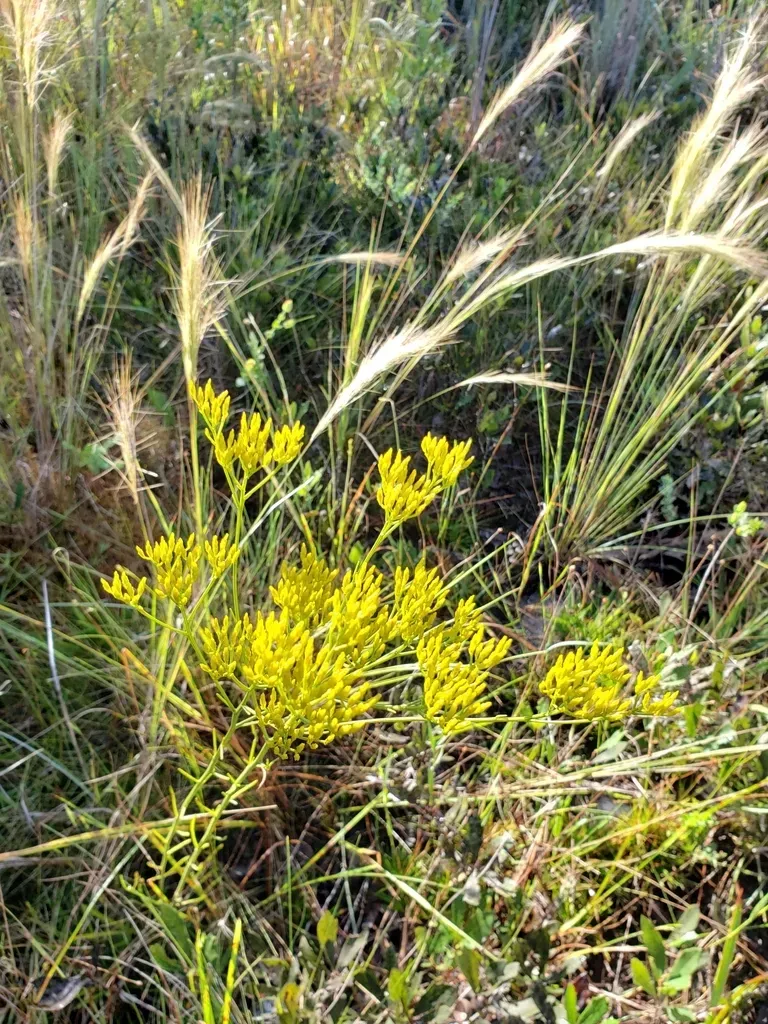 Pineland Rayless Goldenrod (Bigelowia Nudata) is a perennial shrub in the Asteraceae family with easy care difficulty. It requires moderate watering and full sun or partial shade light in USDA hardiness zones 7-9. This plant is safe for cats and dogs.