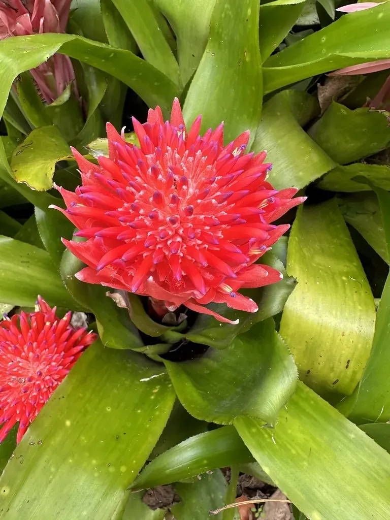 Billbergia pyramidalis is a species of bromeliad native to northern South America, known for its striking torch-like flower bracts and rosette of green leaves.