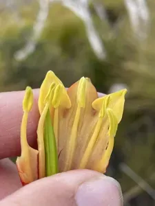 Blandfordia punicea is a perennial herbaceous plant native to western Tasmania, known for its striking tubular red flowers with yellow tips.