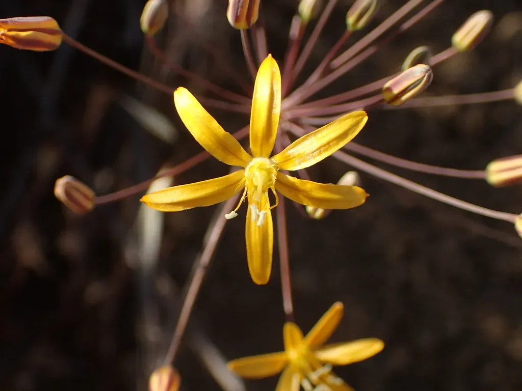 Bloomeria crocea is a perennial herbaceous bulbous plant native to southern California and northern Baja California, known for its bright yellow to orange star-like flowers.