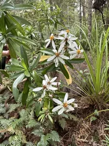 Brachyglottis kirkii is a small epiphytic shrub endemic to New Zealand, known for its purple stems and grey bark, with fleshy leaves and daisy-like flowers.