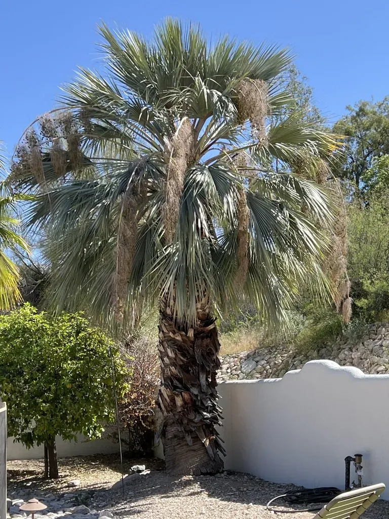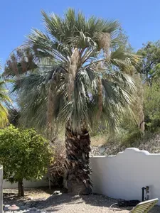 Brahea armata is a slow-growing, single-stemmed palm with distinctive silvery-blue fan-shaped leaves and a solitary greyish trunk.