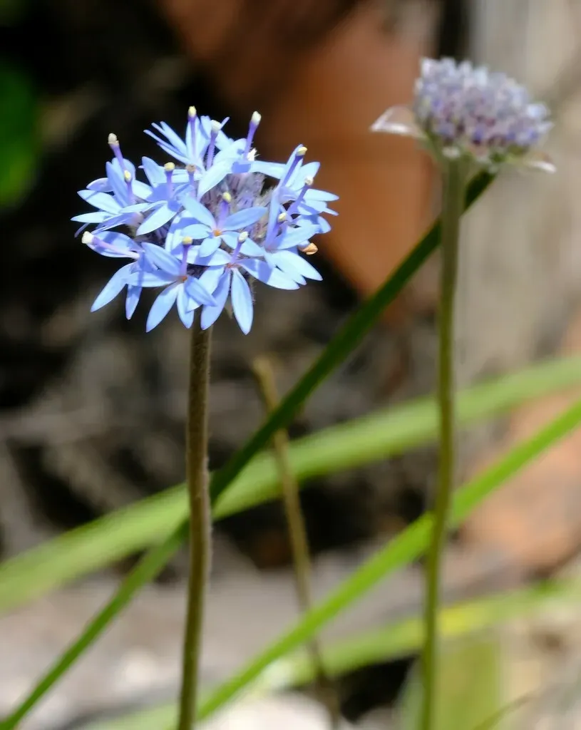 Brunonia australis is a perennial herb known for its distinctive blue flowers and basal cluster of elliptical leaves.