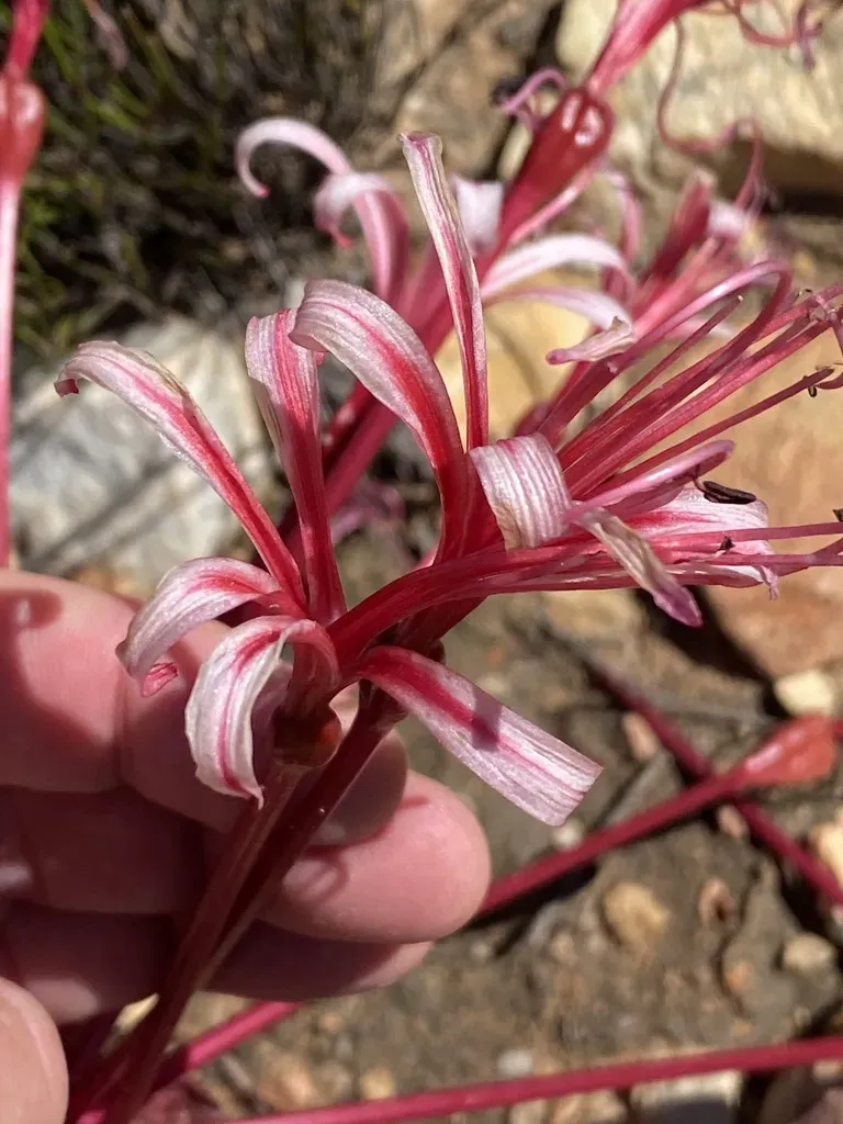 Brunsvigia striata is a rare, non-hardy bulbous perennial native to South Africa, known for its compact growth and large umbels of pink flowers.