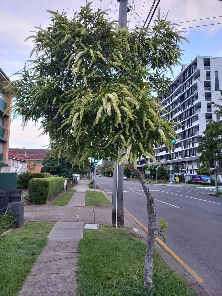 Buckinghamia celsissima is an evergreen tree native to the rainforests of northern Queensland, Australia, known for its glossy dark green leaves and showy creamy flower spikes.