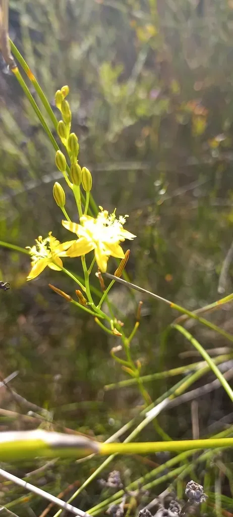 Bulbine favosa is a tuberous perennial herb native to South Africa, characterized by slender, filiform leaves and yellow star-shaped flowers with fluffy stamens.