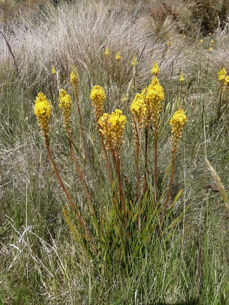 Bulbinella angustifolia is a robust perennial herb known for its long, slender leaves and striking yellow inflorescences that rise in dense, vertical racemes.