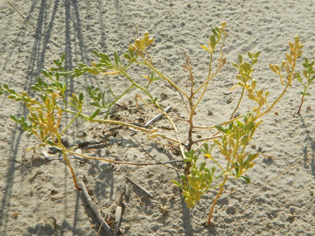 A succulent annual plant commonly found on beaches and dunes in North America, known for its tangy edible leaves and pale lavender flowers.