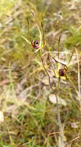 Caladenia leptochila is a terrestrial, perennial, deciduous orchid with one or two yellowish-green and reddish-brown flowers, native to South Australia.