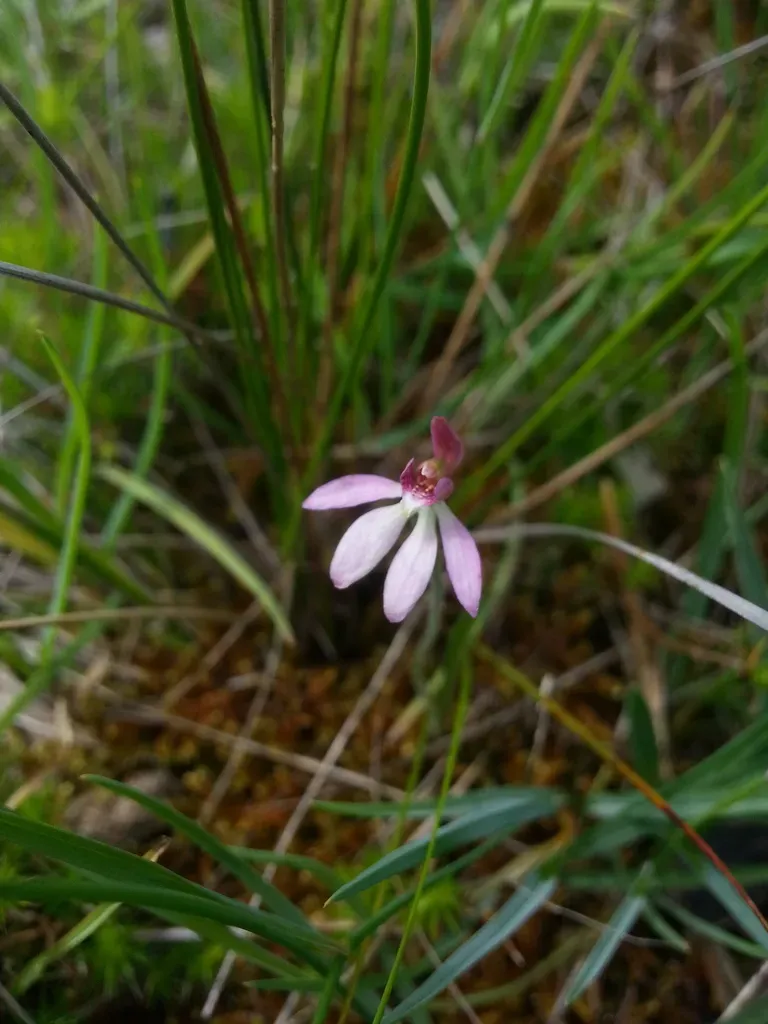 Caladenia pusilla is a tiny terrestrial orchid with a single erect leaf and a solitary pink flower, known for its delicate appearance and small size.