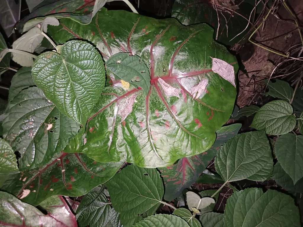 Caladium bicolor is a tender perennial herb grown primarily for its colorful, arrowhead-shaped leaves with striking patterns of green, white, pink, and red.