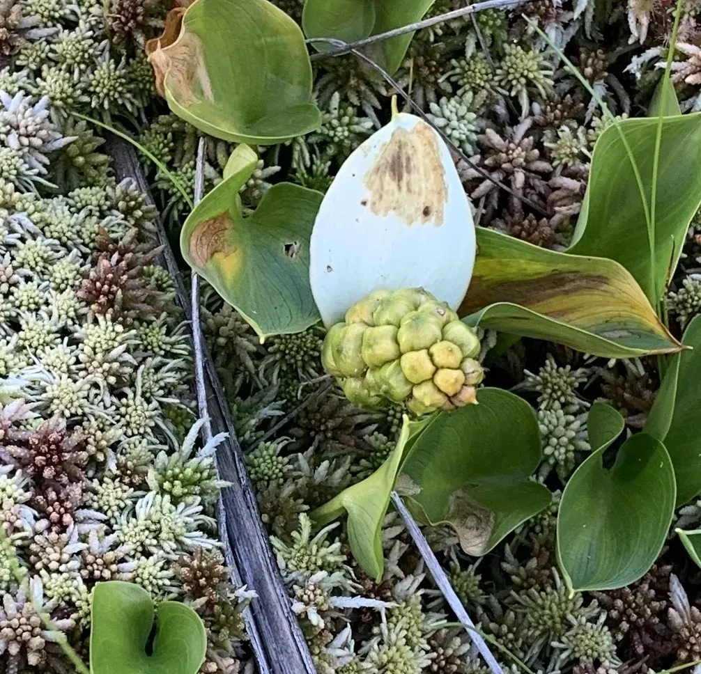 Calla palustris is a rhizomatous perennial aquatic plant known for its broad white spathe and heart-shaped leaves.