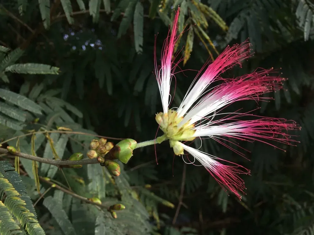 Calliandra selloi is a medium to large-sized shrub known for its finely divided leaves and clusters of vibrant red powder-puff flowers.