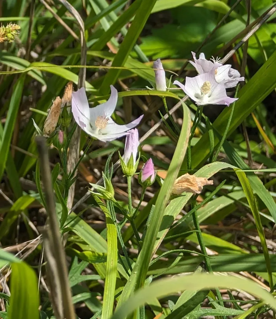 Callirhoe alcaeoides is a perennial wildflower with delicate white to pale pink cup-shaped flowers and deeply lobed leaves, native to dry, sandy or rocky soils in central United States.
