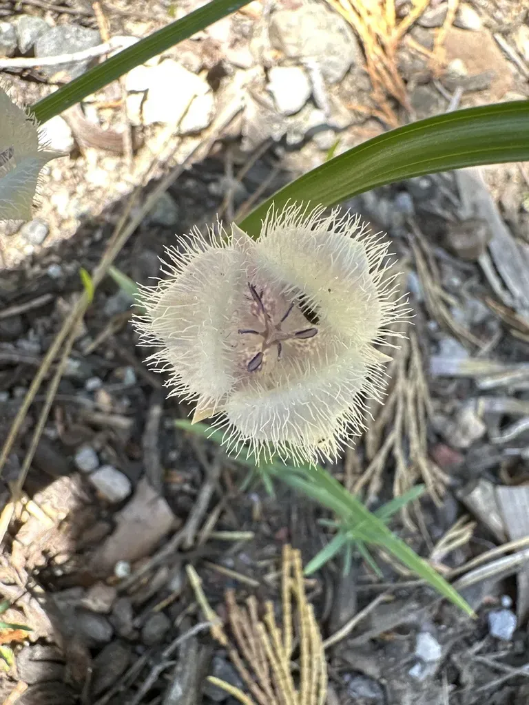 Calochortus coeruleus is a perennial herb native and endemic to California, known for its distinctive light blue, spade-shaped petals covered in brushlike hairs.