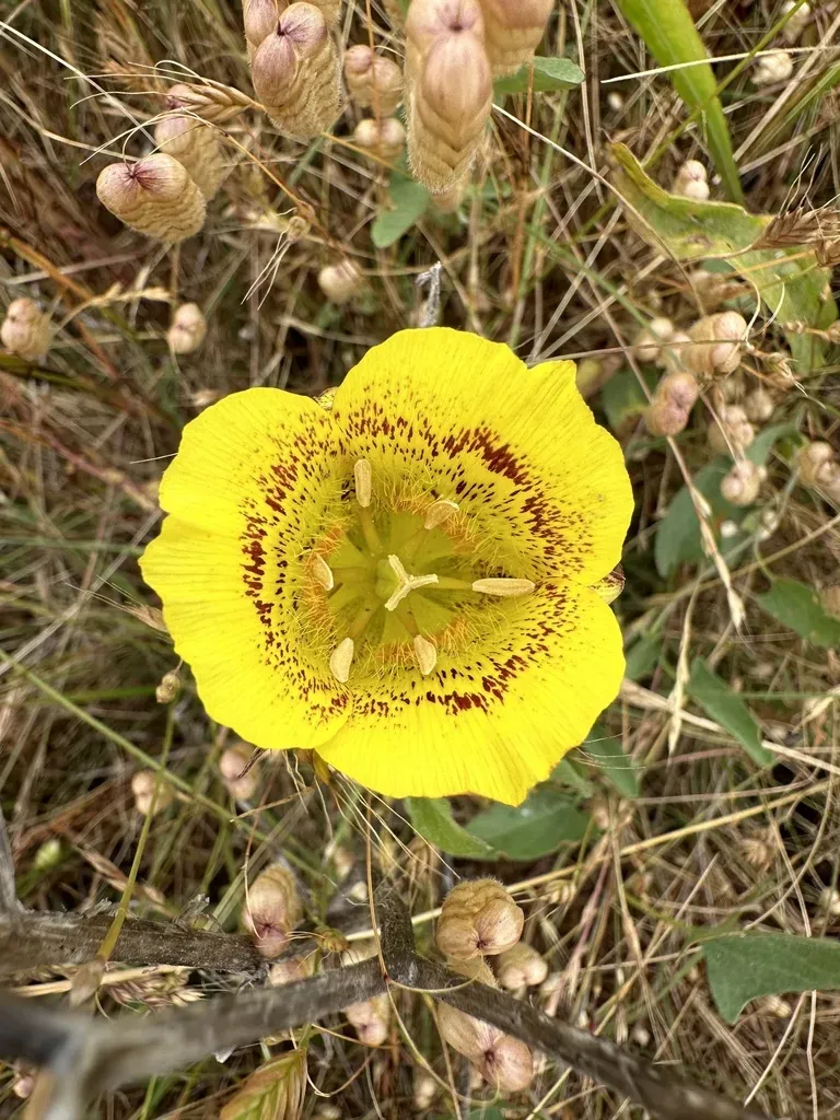 Calochortus luteus, commonly known as Yellow Mariposa Lily, is a perennial herb endemic to California with bright yellow flowers often marked with red-brown streaks.