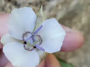 Calochortus nudus is a perennial herb native and endemic to California, known for its bell-shaped white to pale lavender flowers.