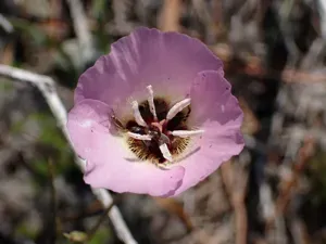 Calochortus palmeri is a perennial herbaceous plant in the lily family, endemic to Southern California, known for its bell-shaped, white to light lavender flowers with brown speckles.