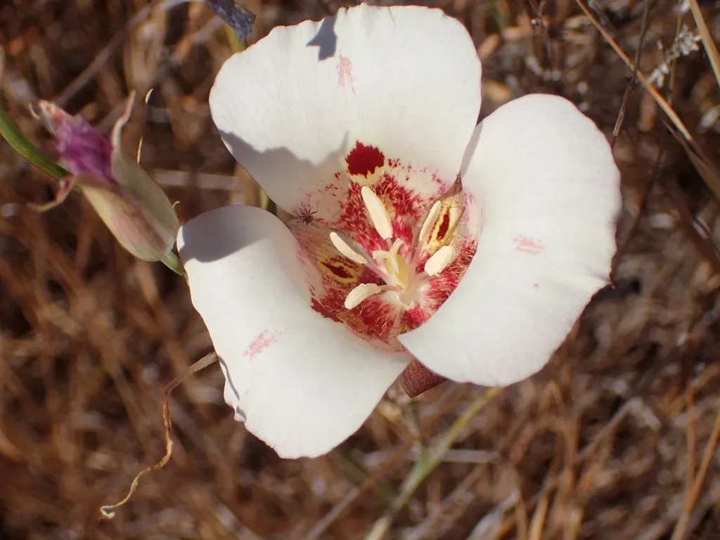 Calochortus venustus is a perennial herbaceous plant endemic to California, known for its strikingly colorful and patterned flowers resembling butterflies.