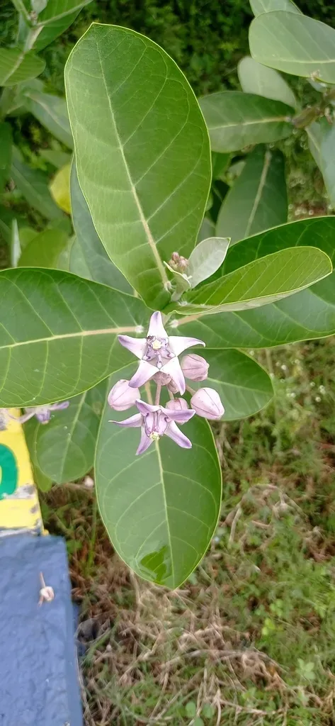 Calotropis gigantea is a large, perennial shrub native to South and Southeast Asia, known for its thick, waxy leaves and clusters of white or lavender star-shaped flowers.