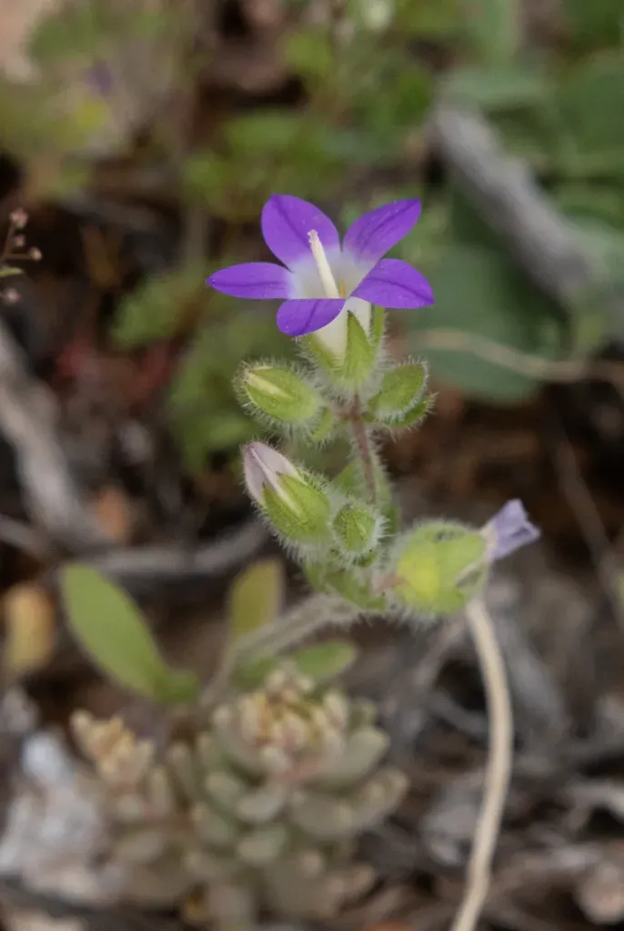 Campanula erinus is a small annual herbaceous plant with bell-shaped flowers, typically growing up to 11 cm tall.