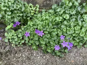 A vigorous, low-growing, mound-forming evergreen perennial with violet-blue bell-shaped flowers and heart-shaped leaves.