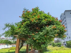 Campsis grandiflora is a vigorous, deciduous, woody vine known for its large, trumpet-shaped orange to reddish flowers and rapid climbing ability.