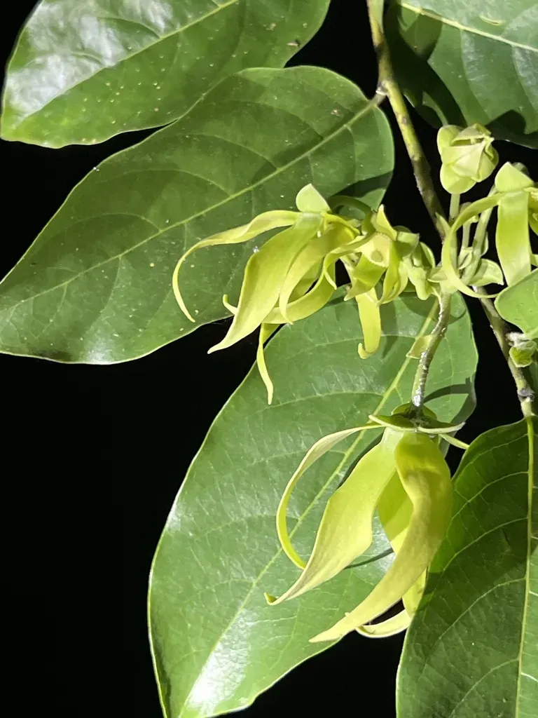 Ylang-ylang (Cananga Odorata) is a perennial tree in the Annonaceae family with moderate care difficulty. It requires moderate watering and full sun or partial shade light in USDA hardiness zones 10-12. This plant is safe for cats and dogs.