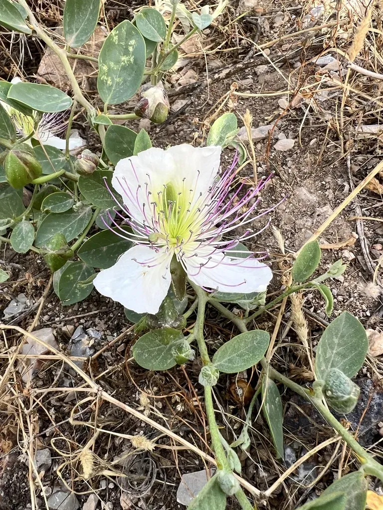 Capparis sicula is a low-growing, woody shrub known for its edible flower buds and fruits, commonly found in Mediterranean coastal habitats.