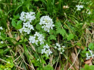 Trifoliate Bittercress (Cardamine Trifolia) is a perennial herb in the Brassicaceae family with easy care difficulty. It requires moderate watering and partial shade or full shade or dappled_shade light in USDA hardiness zones 7-9. This plant is safe for cats and dogs.