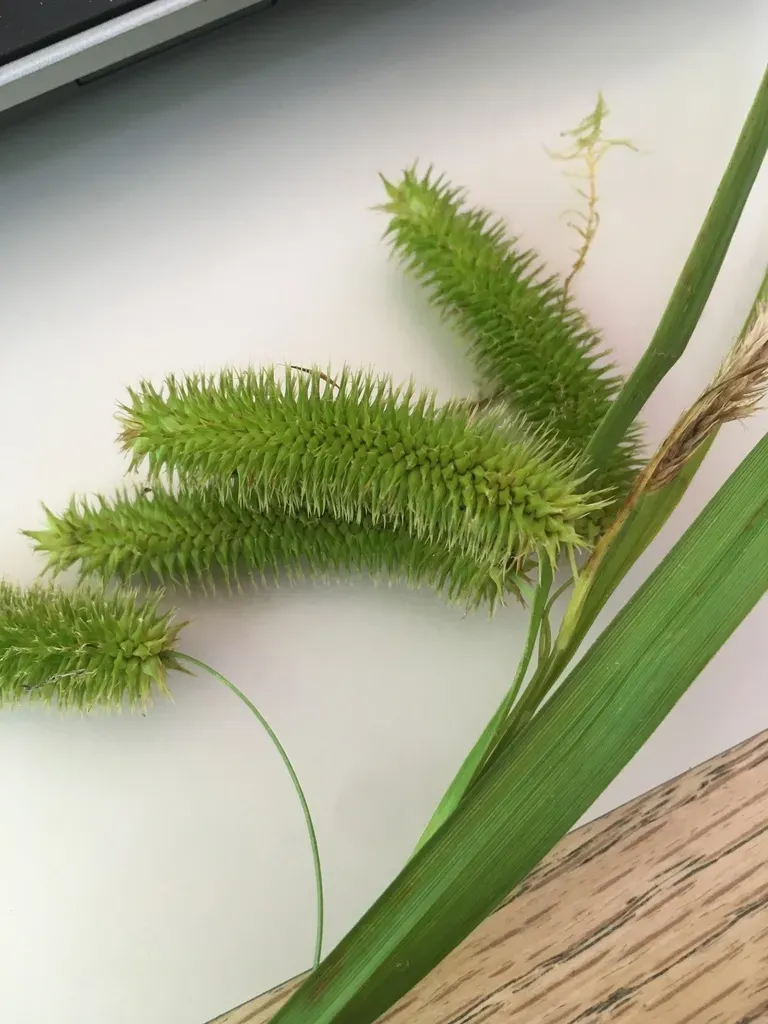 Carex comosa is a perennial sedge native to North America, commonly found in wet habitats such as marshes, swamps, and along riverbanks. It is notable for its large, bristly seed heads and triangular leaf blades.