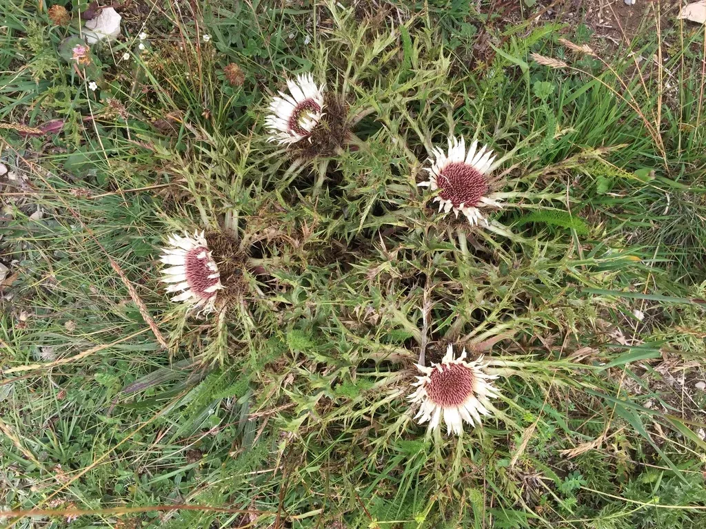 Carlina acaulis is a perennial herbaceous plant known for its thistle-like appearance and striking silver flower heads.
