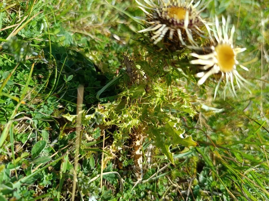 Carlina vulgaris is a biennial herbaceous plant known for its spiny, daisy-like flower heads and oblong leaves that clasp the stem.