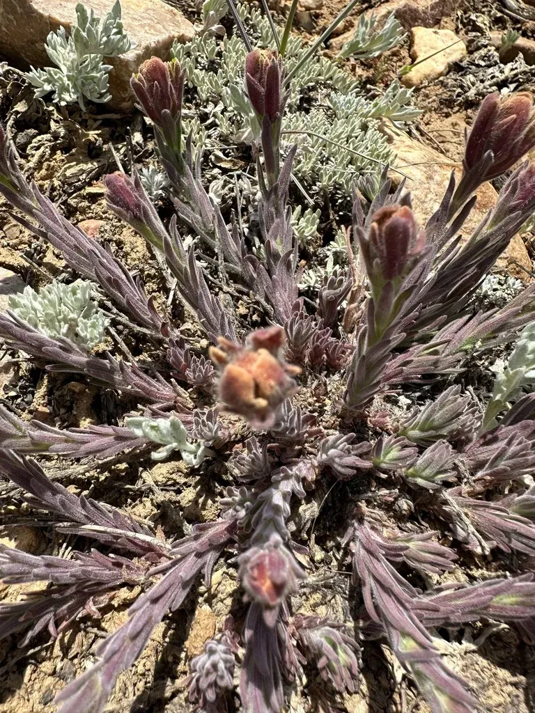 Ashgray Indian Paintbrush (Castilleja Cinerea) is a perennial herb in the Orobanchaceae family with moderate care difficulty. It requires moderate watering and full sun or partial shade light in USDA hardiness zones 7-9. This plant is toxic to cats and dogs — keep it out of reach of pets.