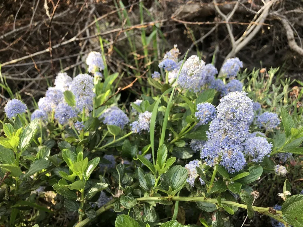 Ceanothus thyrsiflorus is a large evergreen shrub or small tree native to California, known for its glossy green leaves and clusters of blue flowers.