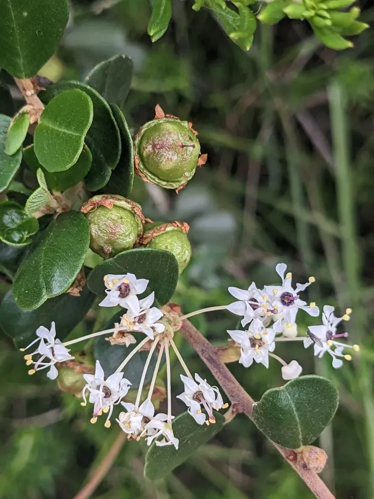Ceanothus verrucosus is a rare evergreen shrub native to California and Baja California, known for its white flowers with dark centers and gray-brown warted stems.