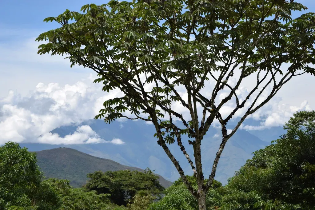 Cecropia angustifolia is a fast-growing tropical tree native to Central and South America, known for its distinctive large lobed leaves and hollow stems that house ants.