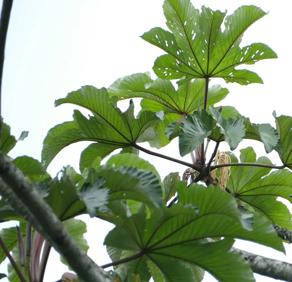 A small to medium-sized tree with large, round, deeply lobed, palmate leaves that are whitish below.