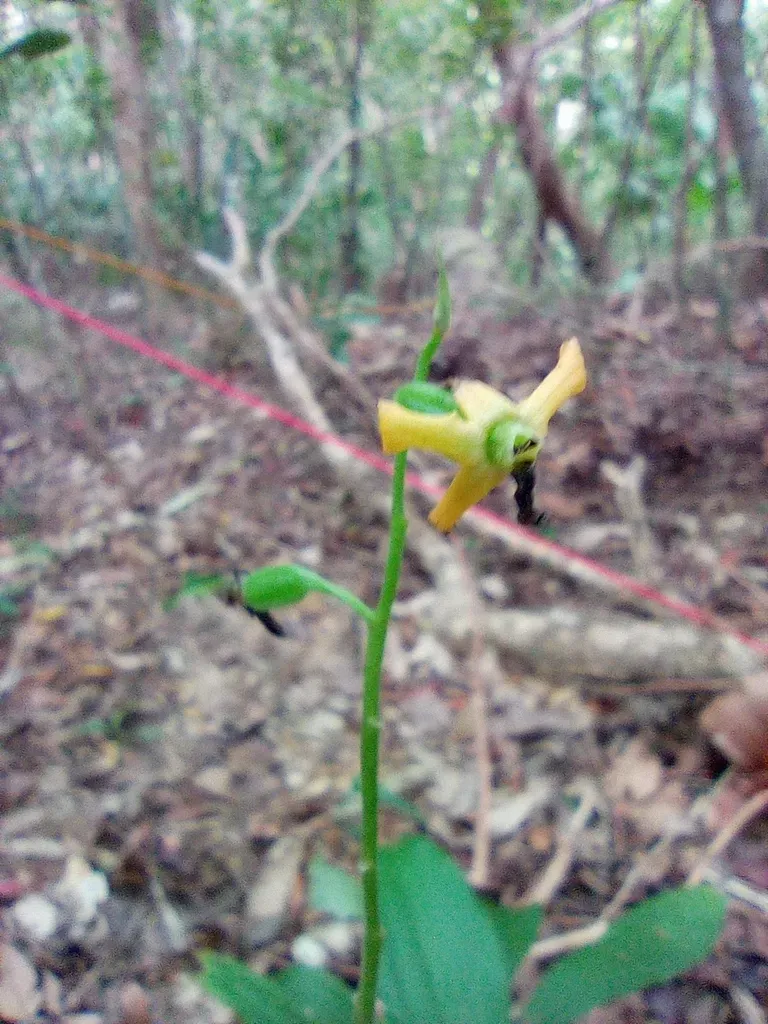 Cephalantheropsis obcordata is a terrestrial orchid species known for its erect stems and elliptic leaves, typically found in waterlogged stream environments.